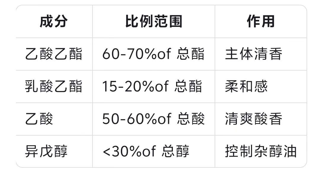 乙酸乙酯 : 乳酸乙酯 ≈ 3:1(突出單一主體香,避免酯類復(fù)雜化)。