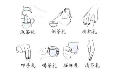 如果是同輩朋友給你泡的茶,可以右手握拳掌心朝下,伸出食指和中指將兩指并攏,在桌面輕叩三下,便是感謝。