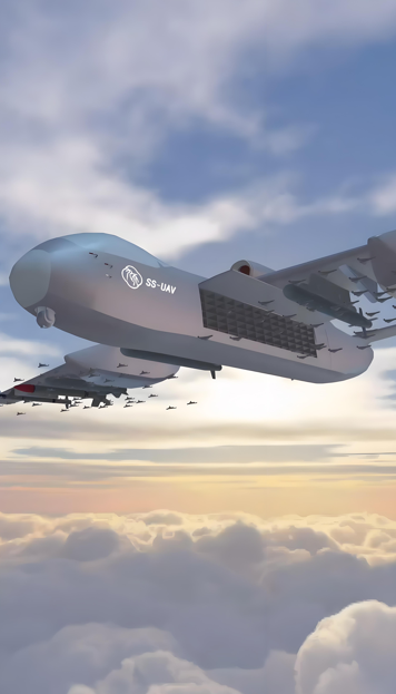 “九天”翼展達(dá)25米,超過(guò)美國(guó)MQ-9“死神”無(wú)人機(jī)20米;最大起飛重量16噸,相當(dāng)于3架殲-10C戰(zhàn)機(jī)空重;最大載重6噸,可攜帶12枚鷹擊-12反艦導(dǎo)彈或200架微型無(wú)人機(jī),火力密度是攻擊-11的3倍。